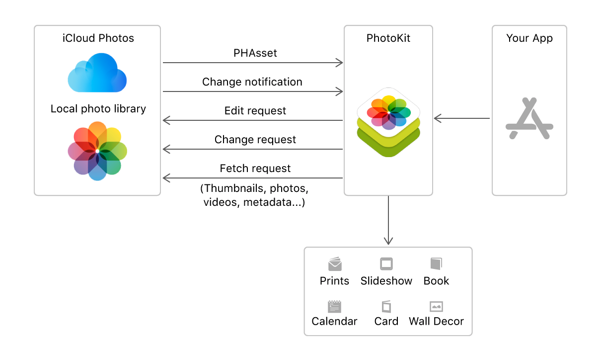 In iOS and macOS, PhotoKit provides classes that support building photo-editing extensions for the Photos app. In iOS, macOS, and tvOS, PhotoKit also provides direct access to the photo and video assets managed by the Photos app.