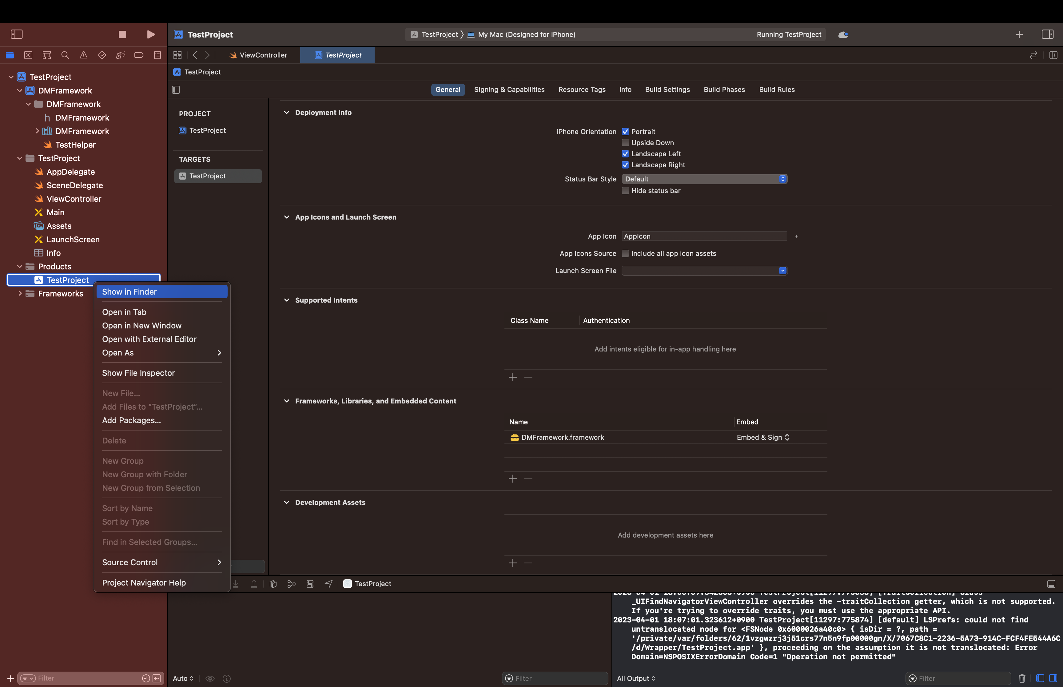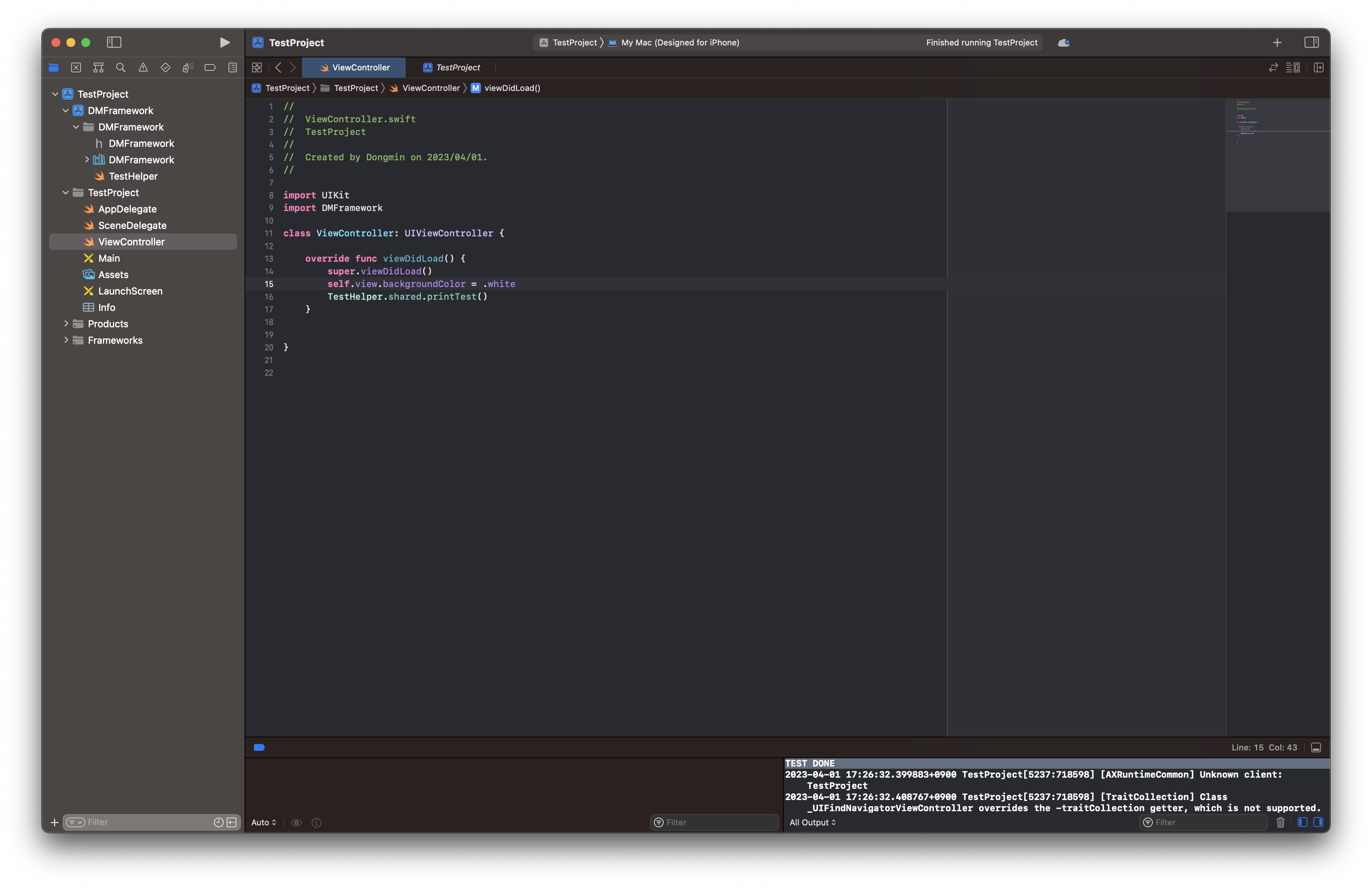 이제 앱에서 해당 Framework를 사용해서 빌드를 해볼게요. 해당 Framework를 import하고 내부의 TestHelper를 접근하면 잘 접근되고 빌드까지 성공하는 것을 알 수 있습니다.