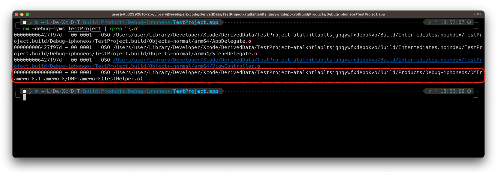 여기서 $nm -debug-syms TestProject | grep “\\.o” 명령어를 입력해주세요. 이 명령어를 통해서 excutable binary 파일에 포함되어 있는 symbol중 object 파일만을 확인할 수 있습니다.
