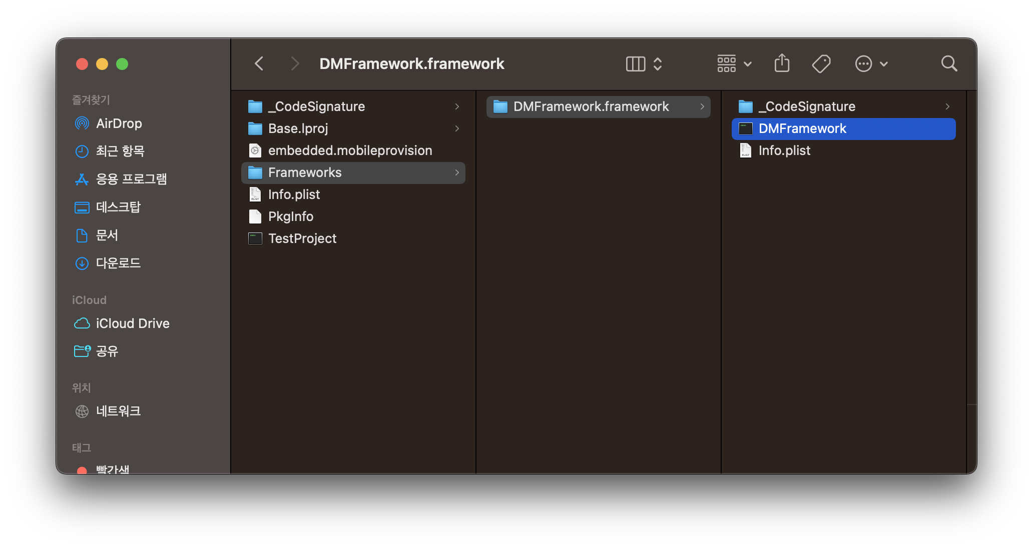 패키지 내용 보기를 통해 들어간 곳에 Frameworks 폴더를 타고 가다보면 우리가 만든 Framework의 excutable binary 파일을 쉽게 확인할 수 있습니다. 와우,, 이래서 Dynamic Framework는 별도의 excutable binary가 생성되고 이를 참조해서 사용한다는 말이 이해가 조금은 되죠?