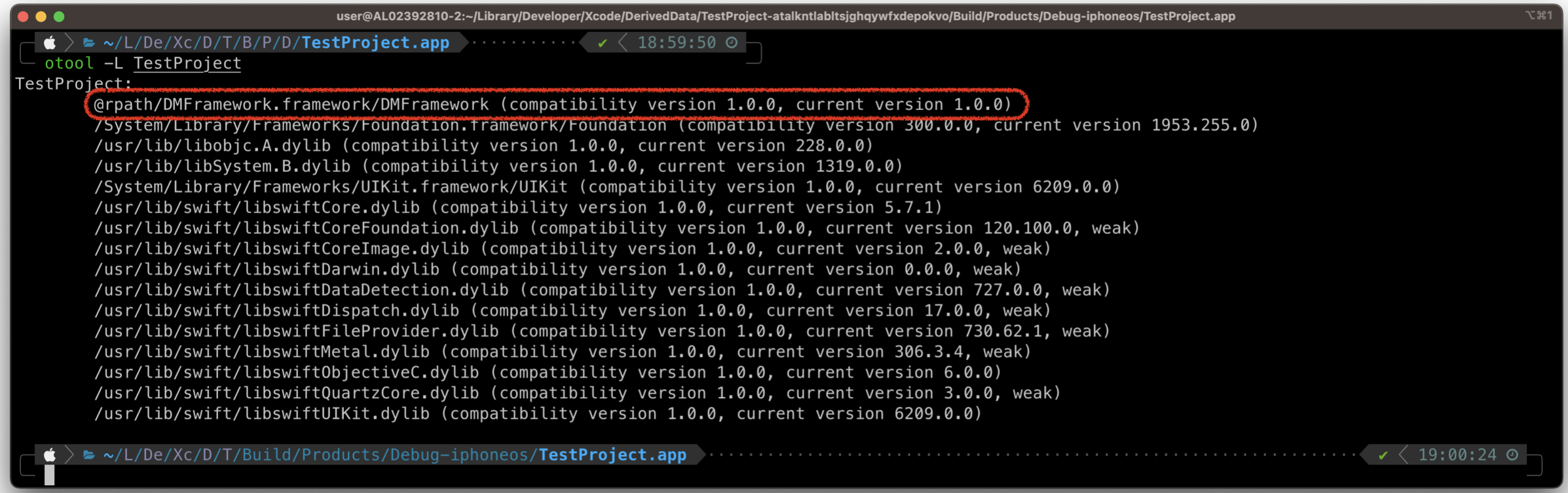 - 해당 프로젝트에서 사용하는 shared library의 경우는 터미널의 $otool -L TestProject 명령어를 통해 확인할 수 있습니다