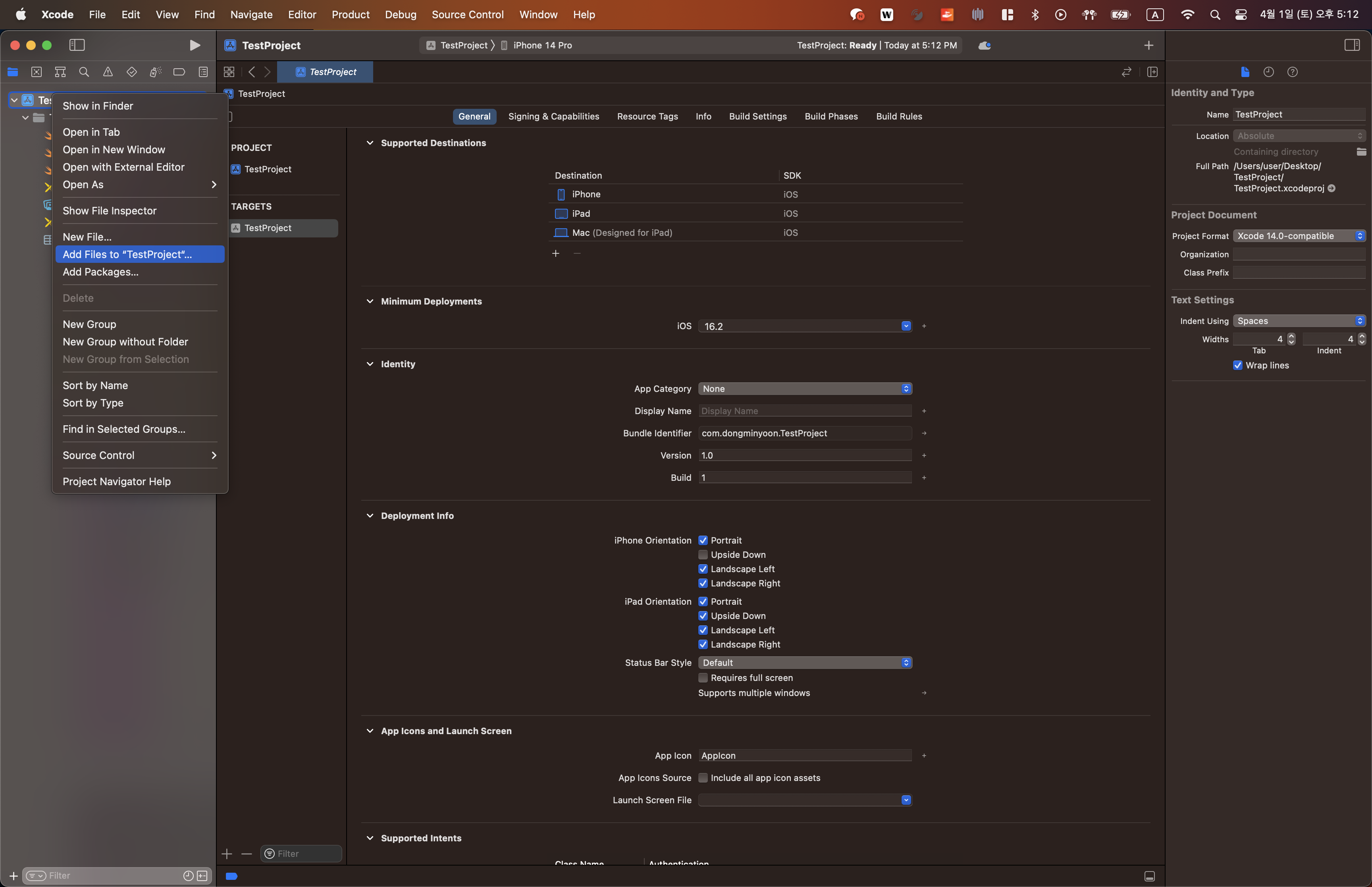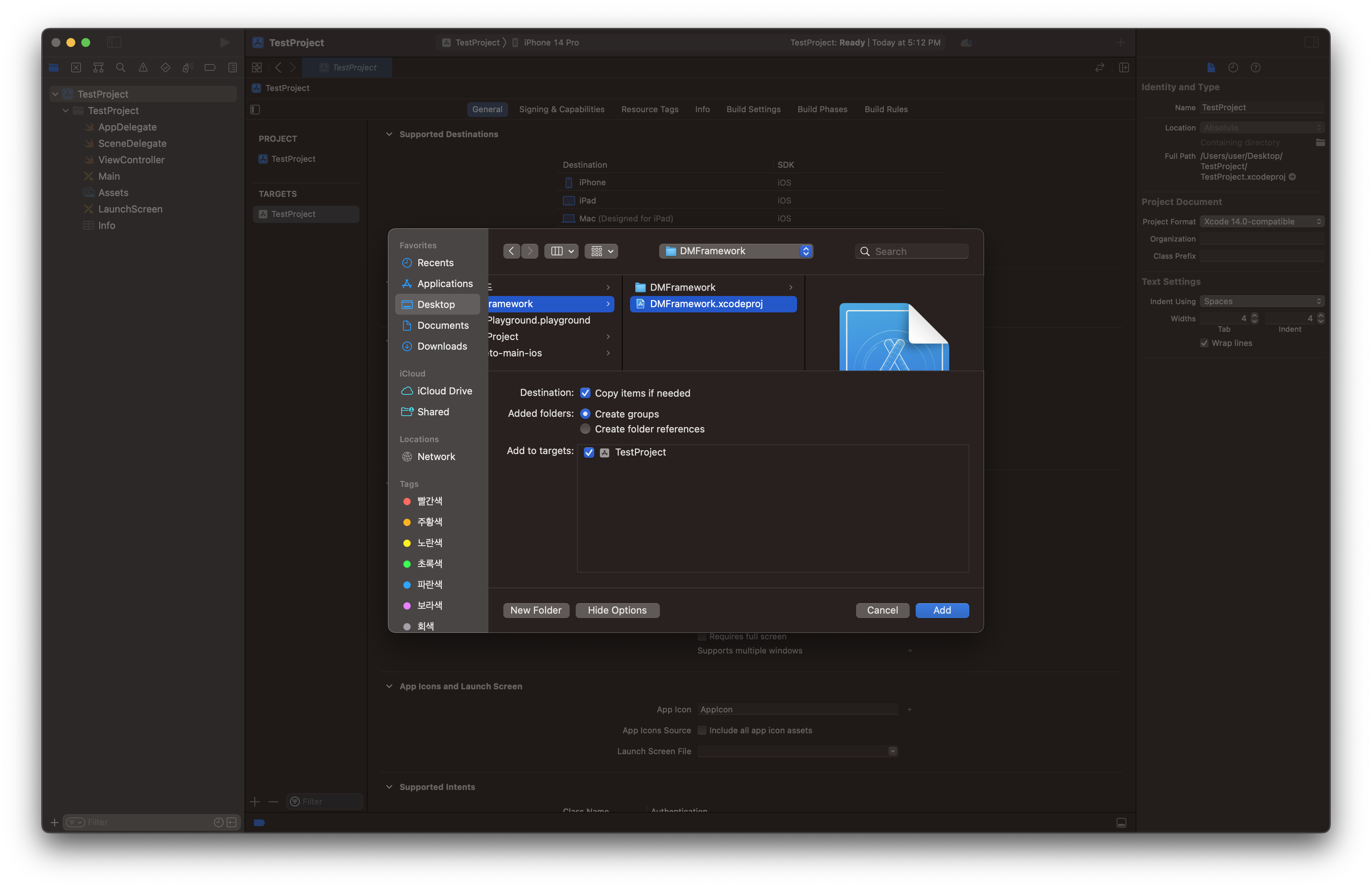 이제 생성했던 Framework 테스트를 위해 앱 프로젝트에 추가해주겠습니다. 앱의 프로젝트에 Add Files to “App Name”을 클릭해서 아까 만들어주었던 Framework의 프로젝트 파일을 추가해줍니다.
