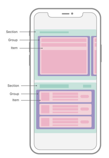 UICollectionViewCompositionalLayout은 한개 혹은 여러개의 Seciton을 가지는데, Section은 안에 여러개의 그룹으로 레이아웃이 나뉘어져 있습니다. 하나의 섹션은 여러개의 그룹 그리고 그룹은 개별 아이템들로 구성되어있습니다.